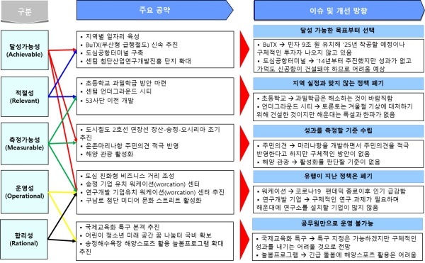 측정 가능성은 공약의 성과를 측정할 수 있는지를 평가하며 도시철도 2호선 연장선 장산-송정-오시리아 조기 추진, 운촌마리나항 주민의견 적극 반영, 해양 관광 활성화를 확인했다.