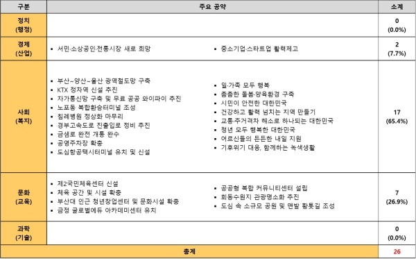 사회(복지) 공약은 △부산~양산~울산 광역철도망 구축 △자가통신망 구축 및 무료 공공 와이파이 추진 △도심항공택시터미널 유치 및 신설 △촘촘한 돌봄·양육환경 구축 △건강하고 활력 넘치는 지역 만들기 △교통·주거격차 해소로 하나되는 대한민국 △기후위기 대응, 함께하는 녹색생활 등 17개다.