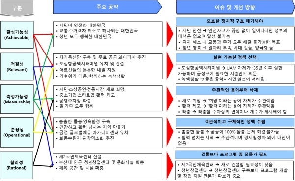 백종헌 의원의 공약을 국정연이 개발한 갑옷(ARMOR), 즉 달성 가능성(Achievable)·적절성(Relevant)·측정 가능성(Measurable)·운영성(Operational)·합리성(Rational) 지표를 적용해 평가했다. 간략한 내역과 개선방안을 정리하면 다음과 같다.