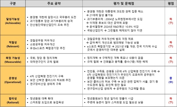 이상민 의원의 공약을 국가정보전략연구소가 개발한 갑옷(ARMOR), 즉 달성 가능성(Achievable) · 적절성(Relevant) · 측정 가능성(Measurable) · 운영성(Operational) · 합리성(Rational) 등 5가지의 지표를 적용해 평가 결과 5개 항목 중 4가지 측면에서 하(下), 1가지 측면에서는 중(中)으로 평가되었다