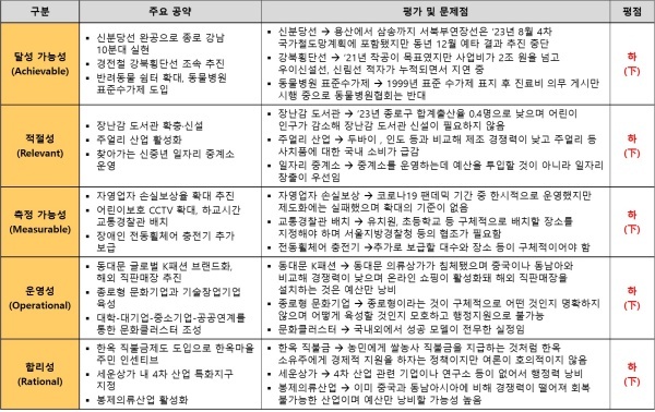 측정 가능성(Measurable) 측면에서 보면 자영업자 손실보상 확대 추진은 코로나19 팬데믹 기간 중 한시적으로 운영했지만 제도화에는 실패했다. 어떻게 확대할 것인지 기준조차 마련하지 못했다. 하교시간 교통경찰관 배치는 유치원, 초등학교 등 구체적으로 배치할 장소를 지정해야 하며 서울지방경찰청 등의 협조가 필요하다.