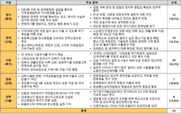 공약은 정치(행정)(12)·경제(산업)(10)·사회(복지)(28)·문화(교육)(7)·과학(기술)(9) 등으로 구성됐으며 사회(복지) 공약이 전체의 42.4%를 차지했다. 다음으로 △정치(행정) 공약 18.2% △경제(산업) 공약 15.2% △과학(기술) 공약 13.6% △문화(교육) 공약 10.6%이다. 요소별 주요 공약은 다음과 같다.