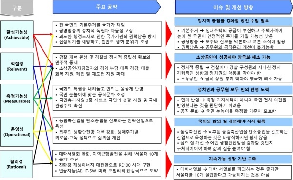 더불어민주당 공약을 국정연이 개발한 갑옷(ARMOR), 즉 달성 가능성(Achievable)·적절성(Relevant)·측정 가능성(Measurable)·운영성(Operational)·합리성(Rational) 지표를 적용해 평가했다. 간략한 내역과 개선방안을 정리하면 다음과 같다.