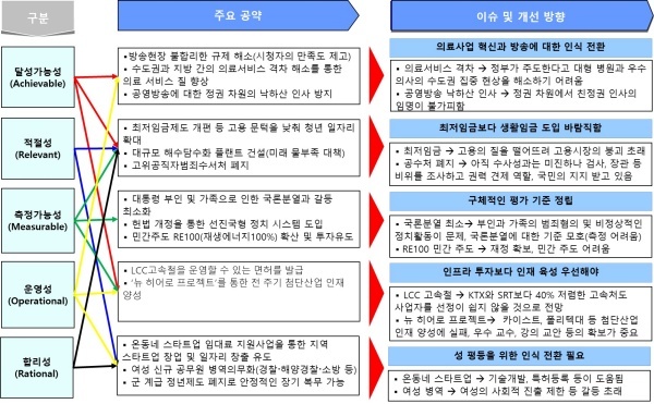 측정 가능성(Measurable) 측면에서 보면 국론분열을 최소화하겠다는 공약은 본말을 잘못 이해하고 있는 것 같다. 윤석열 대통령의 부인과 가족의 범죄혐의 및 비정상적인 정치활동이 문제인데 이를 바롭잡기 보다 국론분열을 강조하는 것 자체가 사실 왜곡이기 때문이다. 국론분열에 대한 기준이 모호해 달성을 측정하기 어렵다.