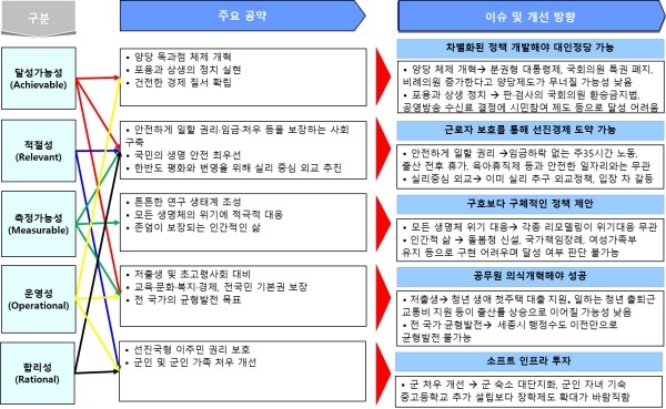 측정 가능성(Measurable) 측면에서 보면 튼튼한 연구 생태계 조성은 윤석열정부의 연구비 삭감 정책에 대한 반대를 위해 제시되었지만 친환경 선박 전환에 정부 지원 확대, 분산에너지 활성화, 기후위기 시대 신산업분야 R&D 지원 등으로 연구생태계가 강화되는 것은 연관성이 낮다.