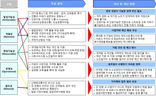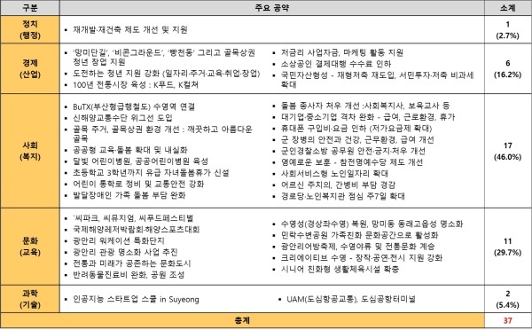 달성 가능성은 4년 임기 내에 완료할 수 있는지를 평가하며 대기업·중소기업 격차 완화 - 급여, 근로환경, 휴가, 전통과 미래가 공존하는 문화도시, 인공지능 스타트업 스쿨 in Suyeong, UAM(도심항공교통), 도심공항터미널 등을 분석했다.