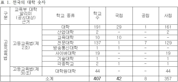 ▲ 전국의 대학 숫자