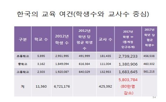 - 학생 숫자의 급격한 감소에도 불구하고 교장, 교감, 보건교사, 영양교사, 사서교사 등을 제외하고 수업하는 시수에 따른 OECD 기준으로 교사 대 학생 숫자를 산정할 경우 우리나라는 아직도 13만7000명이 부족한 실정입니다.