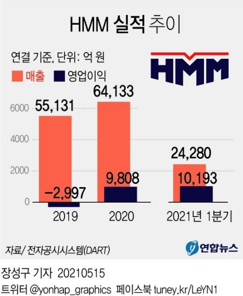 - 공중 분해된 한진해운과 현대상선을 통합하고 공적 자금을 투자하여 HMM이라는 해운회사를 설립했습니다. 지난해 순이익이 1조원을 넘었고, 올해는 1분기에만 순이익 1조 193억원을 넘겨, 전체적으로 약 4조 원 이상의 순이익을 남길 것으로 기대되고 있습니다.