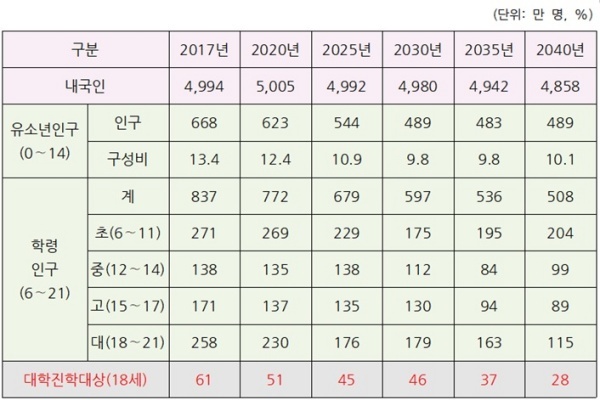 - 통계청 자료를 보면 내국인을 기준으로 학령인구(6∼21세)는 2000년에 약 980만명이었다가, 2020년 772만명으로 이미 지난 20년 동안 200만명 이상 감소했습니다. 그런데 앞으로도 계속 줄어들어 2040년에는 508만 명이 되어, 향후 20년간 263만 명이 더 감소할 것으로 전망하고 있습니다.