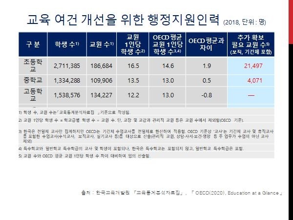 - 그런데, 아동 숫자가 줄어드니 교사 숫자와 관련 예산도 줄여야겠다는 기재부나 급속한 학령 아동 숫자의 감소를 교육의 질의 획기적인 상승이나 교육 경쟁력 강화의 기회로 사용하지 못했습니다. 교사 정년을 보장하는데만 급급했던 교육부와 교육계는 결국 OECD 평균 수준의 교사대 학생 비율이 달성되었지만, 교육 수준은 올라가지 않은 결과를 초래하고 말았습니다.