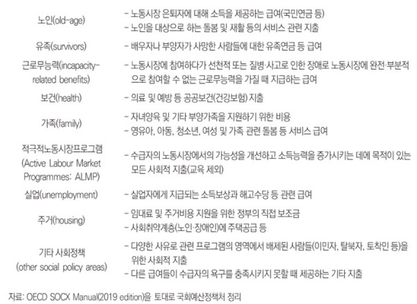 - OECD는 지출주체를 공공과 민간으로 구분하여 1)공공사회복지지출(Public Social Expenditure), 2)법정 민간 사회복지 지출(Mandatory Private Social Expenditure), 3)자발적 민간 사회복지 지출(Voluntary Social Expenditure), 4)순 사회 복지 지출(Net Social Expenditure)의 4개 지출통계를 모두 합한 것입니다.