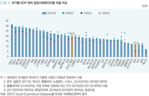 복지지출은 OECD 국가들에 비해 절반 수준인 11.1%에 불과, 한국은 저부담-저복지 국가 중의 하나로 복지지출 확대가 필요