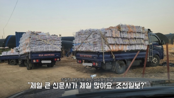 - 포장지도 뜯지 않은 신문들이 폐지로 계란판을 만드는 공장에 판매되고 있고, 특정 신문의 경우 발행되자마자 바로 동남아에 과일 포장지 용도로 말도 않되는 싼 가격에 폐지로 수출되고 있는 것이 확인된 것입니다.