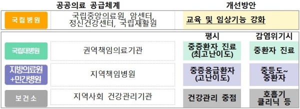 - 즉 지역의 국립병원은 권역별 책임 의료기관이 되어 평소에는 중증환자 진료를 하지만, 감염위기 발생시는 해당 질환의 중환자 진료 중심으로 기능을 바꿔야 합니다. 이번 정책발표를 계기로 앞으로는 평시와 감염병 유행 시 구분하여 국공립 병원의 기능과 역할을 정립하고 연계를 강화하게 됩니다.