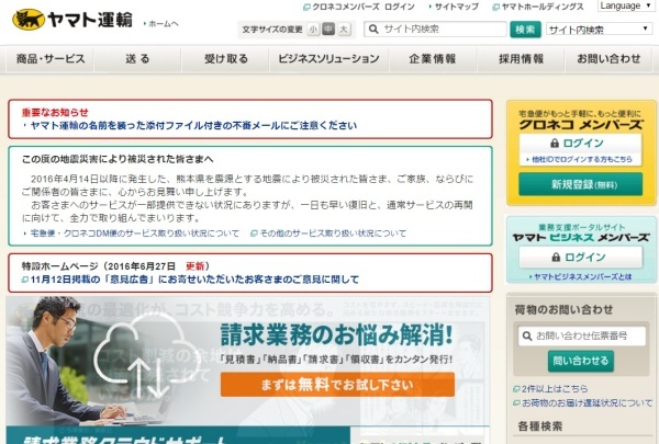 ▲일본 대표 운송업체 야마토운수 홈페이지