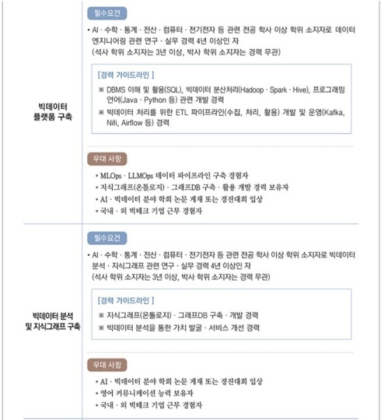 선발분야(특정직 6급)는 AI 인프라 구축·운영, 빅데이터 플랫폼 구축, 빅데이터 분석 및 지식그래프 구축, MLOps개발, AI 미래 기술 등