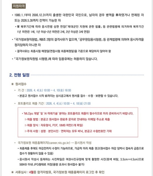 [국정원 채용 정보 - AI 분야 본공고] 2026년도 국가정보원 경력직 상시채용 3차 본공고(원서접수 기간 : 2026.4.4(토) 10:00~4.10(금) 16:00)