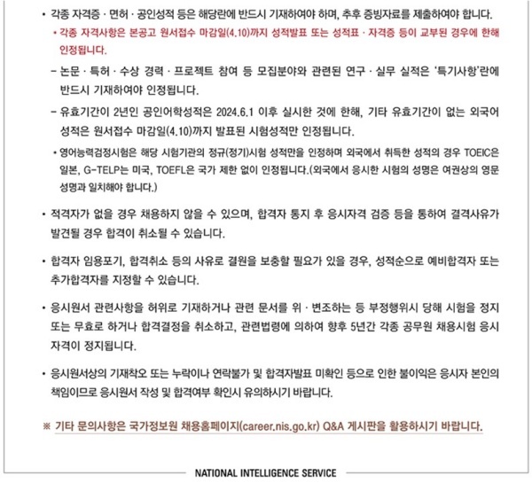 ※. 자세한 내용은 국가정보원 채용공고 사이트 확인