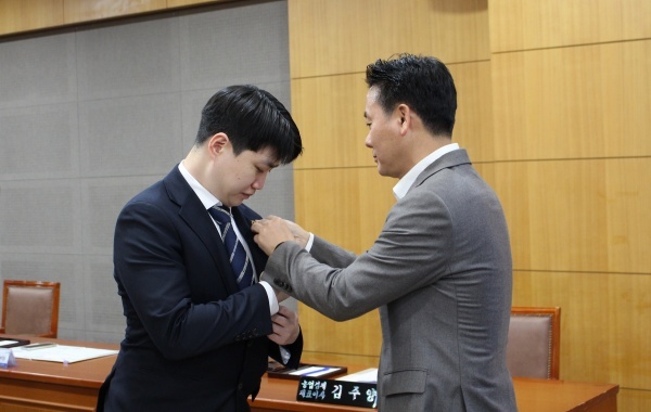 ▲ 김주양 농업경제대표이사(오른쪽)가 13일 서울 중구 농협중앙회 본관에서 진행된「2026년 상반기 농업경제부문 신규직원 임용장 교부식」에서 신규직원에게 농협 배지를 직접 달아주고 있다 [출처=농협중앙회]