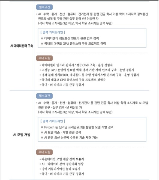 • AI·수학·통계·전산·컴퓨터 · 전기전자 등 관련 전공 학사 이상 학위 소지자로 AI 모델 관련 연구·실무 경력 4년 이상인 자(석사 학위 소지자는 3년 이상, 박사 학위 소지자는 경력 무관)