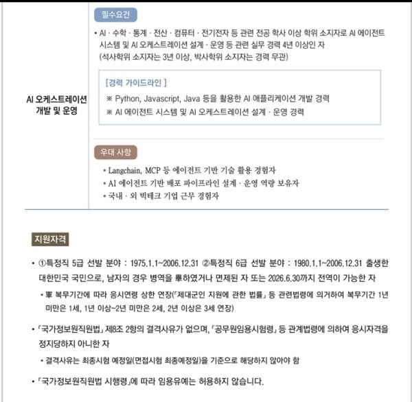 선발분야(특정직 5급)는 MLOps 설계 및 구축, AI 모델 설계·최적화, AI 데이터센터 구축, AI 모델 개발, AI 오케스트레이션 개발 및 운영 등