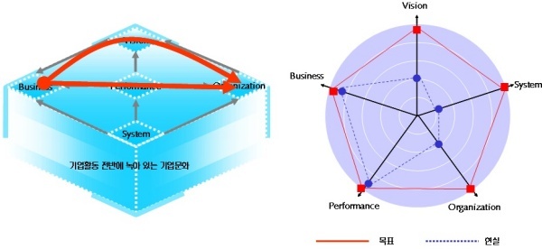 한 방향으로는 사업에 적합한 비전을 설정하고 다른 방향으로는 성과를 관리해 두 지향점이 모두 조직으로 모이게 하는 전략이다.