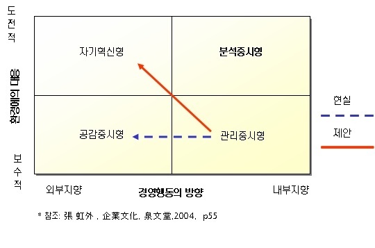 그림은 경영행동의 방향과 환경에의 대응이라는 지표로 기업문화의 행태를 분류한 것이다. 경영행동을 외부지향과 내부지향, 환경에의 대응을 도전적과 보수적으로 구분해 기업문화를 자기혁신형, 분석중시형, 공감중시형, 관리중시형으로 나눴다.