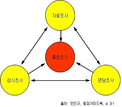 넷째, 통합조사는 최소한 한 가지 이상의 조사기법을 복합적으로 활용하는 것을 말한다. 자료조사를 통해 확인한 사실(fact)를 면담을 통해 진위여부를 파악하거나 면담조사를 통해 파악한 내용을 감시조사를 통해 검증하는 것이다.