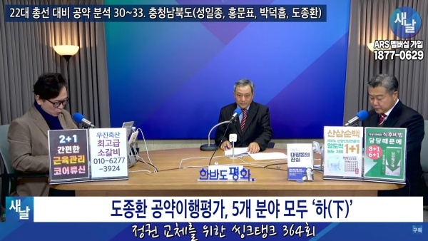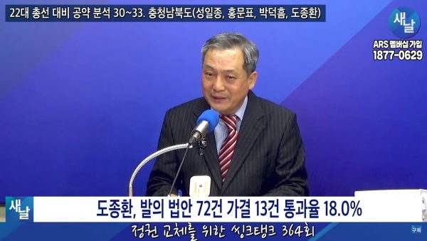 2024년01월09일(화요일) 새날 유튜브 방송은 2020년 21대 국회의원 선거에서 당선된 충청북도 청주시 흥덕구 도종환 의원이 제시한 선거공약을 평가했다. 평가를 위한 방송에는 푸른나무, 이상구 원장, 민진규 소장(국가정보전략연구소)이 출연했다.