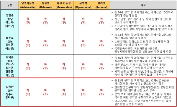 도종환 의원이 제시한 53개 공약은 서산시·태안군 성일종 의원, 홍성군·예산군 홍문표 의원, 충청북도 보은군·옥천군·영동군·괴산군 박덕흠 의원과 마찬가지로 △달성가능성 △적절성 △측정가능성 △운영성 △합리성 등 5개 영역 모두에서 최하인 하(下) 평점을 받았다.