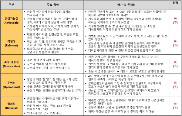 평가방법은 국가정보전략연구소(국정연)가 개발한 ‘오곡(五穀)밸리혁신(5G Valley Innovation)-선거공약(ARMOR)’ 평가 모델을 적용했다.