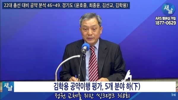 2024년02월06일(화요일) 새날 유튜브 방송은 2020년 21대 국회의원 선거에서 당선된 경기도 안성시 김학용 의원이 제시한 선거공약을 평가했다. 평가를 위한 방송에는 푸른나무, 이상구 원장, 민진규 소장(국가정보전략연구소)이 출연했다.